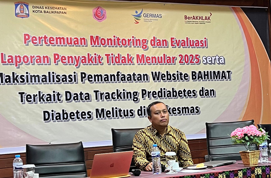 PKMK-Balikpapan. Pertemuan Monitoring dan Evaluasi (Monev) Laporan Penyakit Tidak Menular (PTM) Tahun 2025 serta maksimalisasi pemanfaatan website BAHIMAT terkait data tracking prediabetes dan Diabetes Melitus (DM) di Puskesmas Kota Balikpapan pada Rab (19/11) dibuka oleh dr. Erica Handritha selaku Plt Kepala Bidang P2P Dinas Kesehatan Kota Balikpapan. Dalam sambutannya, Erica memberikan penekanan serius terhadap pengendalian PTM, terutama DM, menyoroti ancaman beban biaya kesehatan yang besar, dengan prediksi bahwa BPJS akan membiayai secara signifikan layanan hemodialisa (cuci darah) di rumah sakit. Oleh karena itu, pihaknya mengingatkan pentingnya meminimalisir dampak agar penyandang DM tidak cepat mengalami komplikasi seperti nefropati diabetik atau retinitis yang menyebabkan kebutaan. Erica menegaskan bahwa setiap kegiatan Puskesmas, di dalam maupun di luar gedung, minimal harus mampu mendeteksi tiga PTM utama, yakni DM, hipertensi, dan obesitas, dan petugas wajib membawa perlengkapan lengkap seperti alat pemeriksaan darah, tensi, dan meteran lingkar perut. Kemudian, tindak lanjut sangat krusial, terutama pada hasil pemeriksaan yang menunjukkan kondisi pra penyakit (prediabetes) atau kondisi penyakit (DM), dengan fokus meminimalisir dampak. Selain itu, narasumber juga menyinggung ancaman minuman berpemanis yang rata-rata mengandung 22,8 gram gula per sajian, yang terbukti meningkatkan risiko obesitas, hipertensi, dan penyakit jantung koroner, mengingat survei 2018 menunjukkan 60% penduduk Indonesia mengkonsumsi minimal satu jenis minuman manis per hari. Plt Kabid P2P juga melaporkan bahwa capaian Standar Pelayanan Minimal (SPM) untuk Usia Produksi dan hipertensi masih di bawah 76% menjelang TW IV, menyebut beberapa Puskesmas seperti Gunung Sari Ulu, Karang Jati, Lamaru, dan Batu Ampar yang perlu meningkatkan capaian hipertensi mereka.